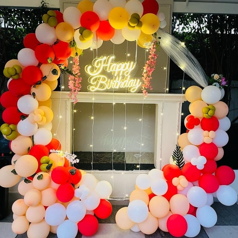 Yes, you can fully customise colours and themes. Our team sends 2–3 theme options with photos on WhatsApp and you can choose the backdrop, balloon colours, neon or LED text and any add-ons like number lights, name boards or fresh flowers.
